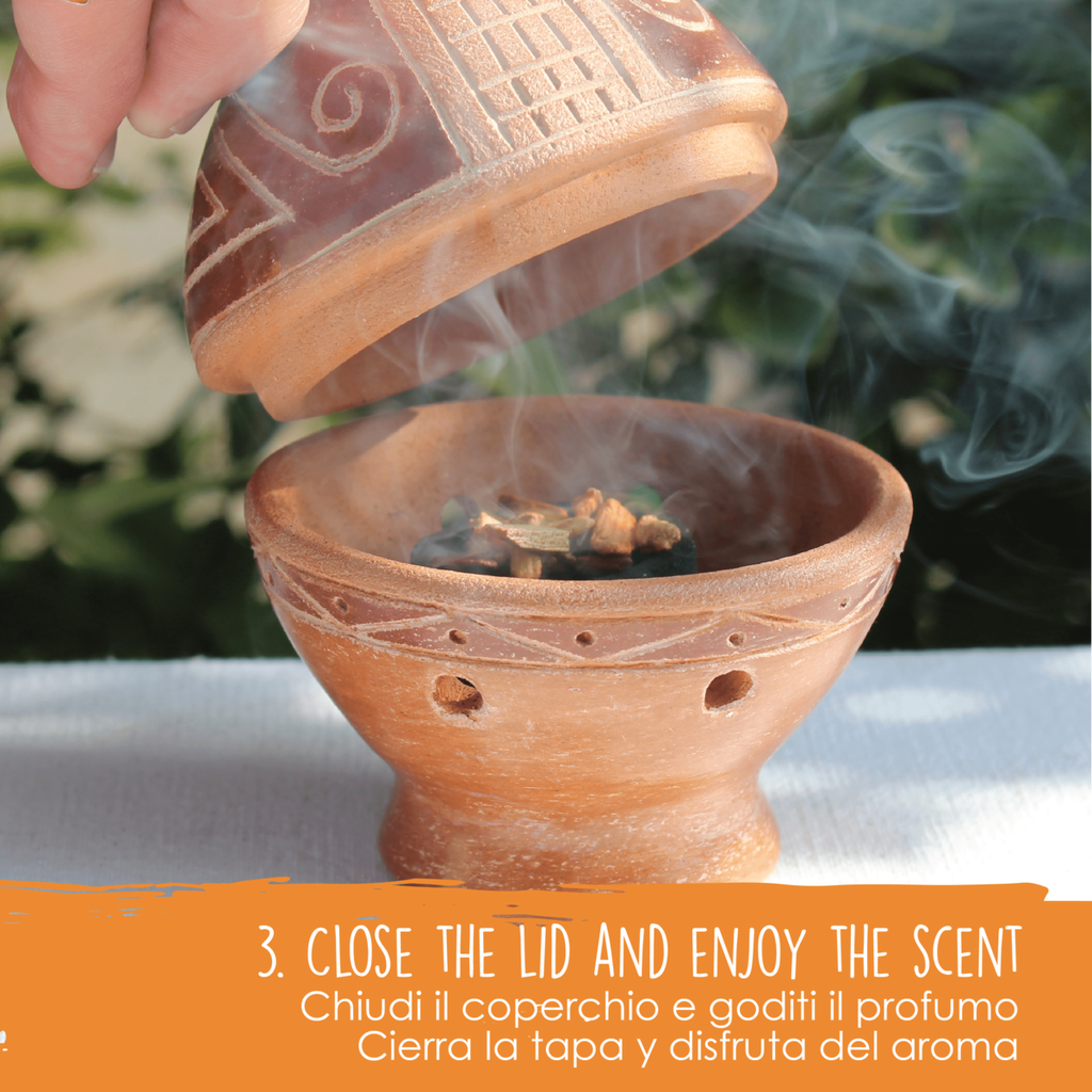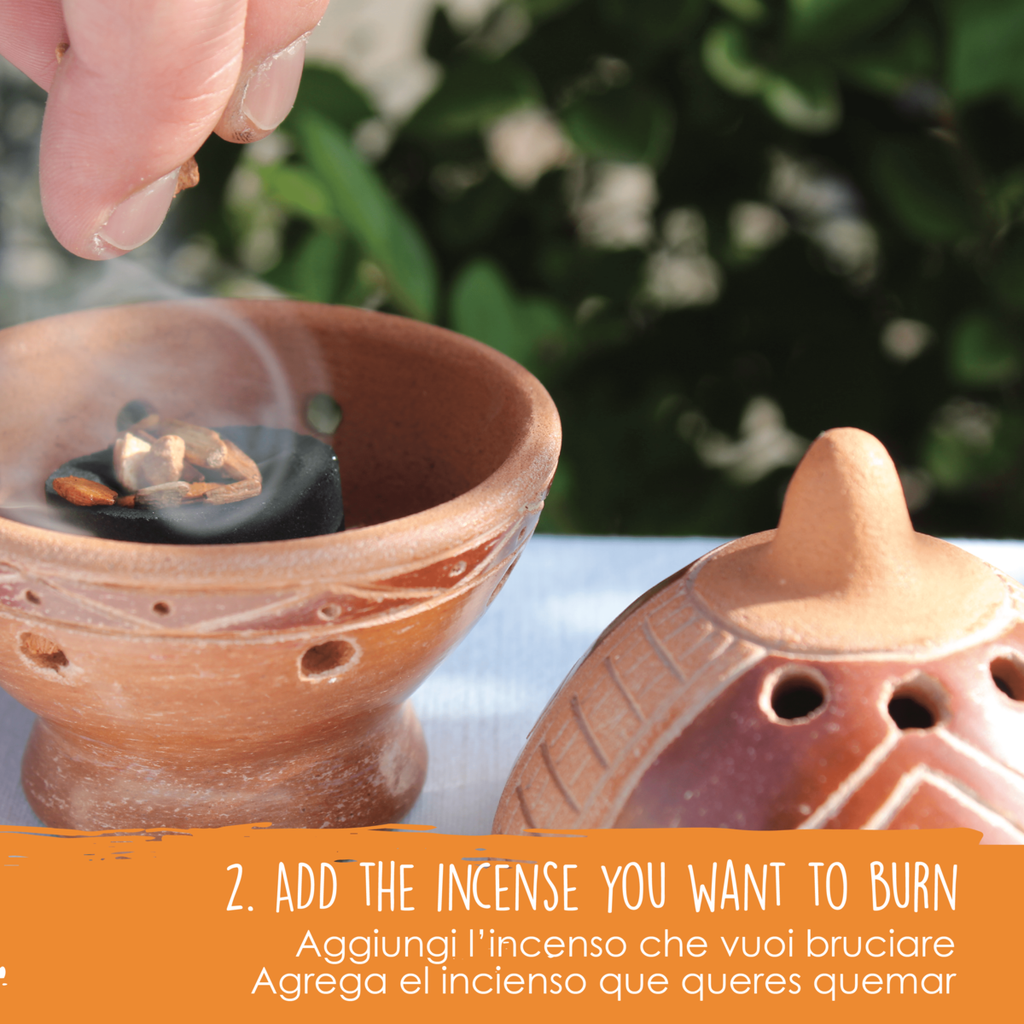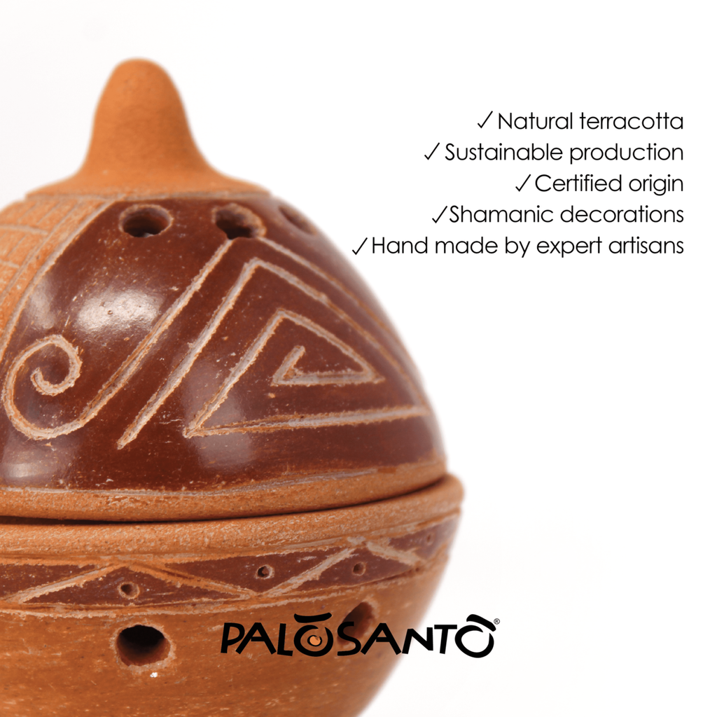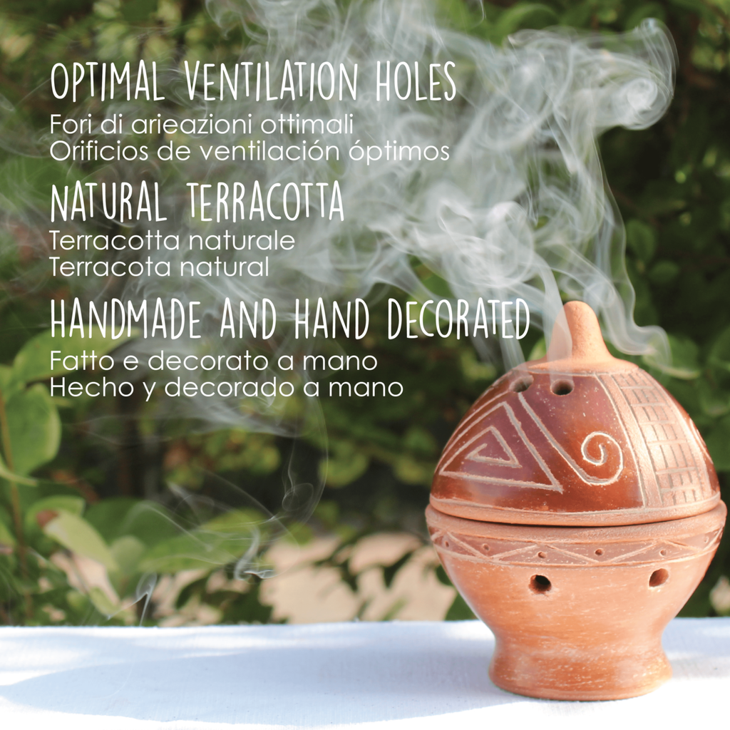 Handcrafted terracotta incense burner made in Ecuador: ideal for burning resins, grains and Powder with charcoal. Thanks to the holes at its base and on the lid, it guarantees balanced and long-lasting fumigation.