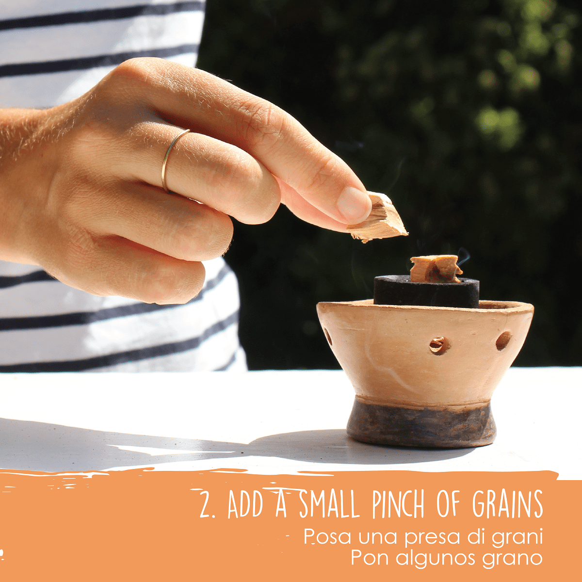 1. Light a charcoal and place it on the metal grid that is inside the brazier (look at one of our handmade braziers).