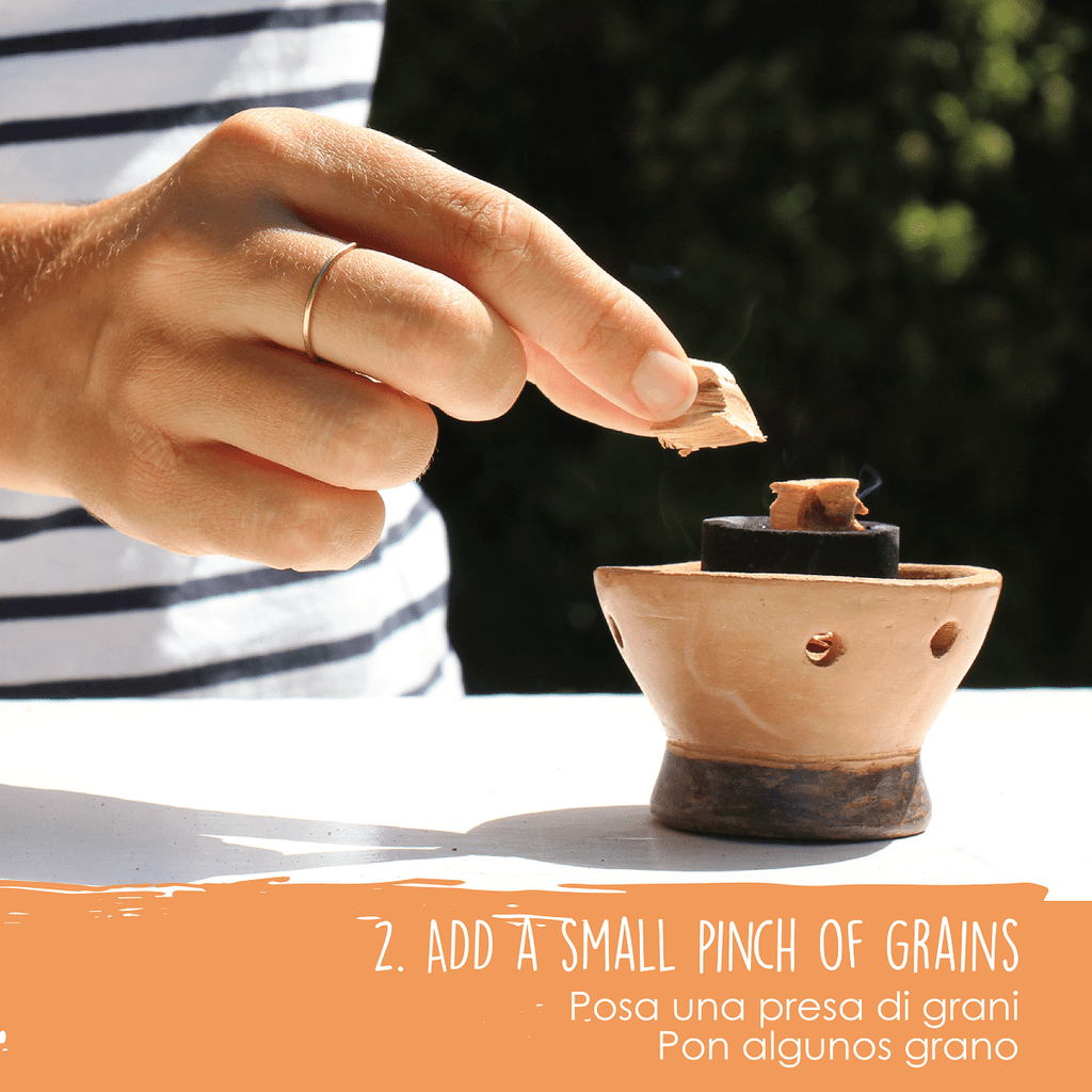 2. When the charcoal starts burning, take a pinch of grains and place it on it.
