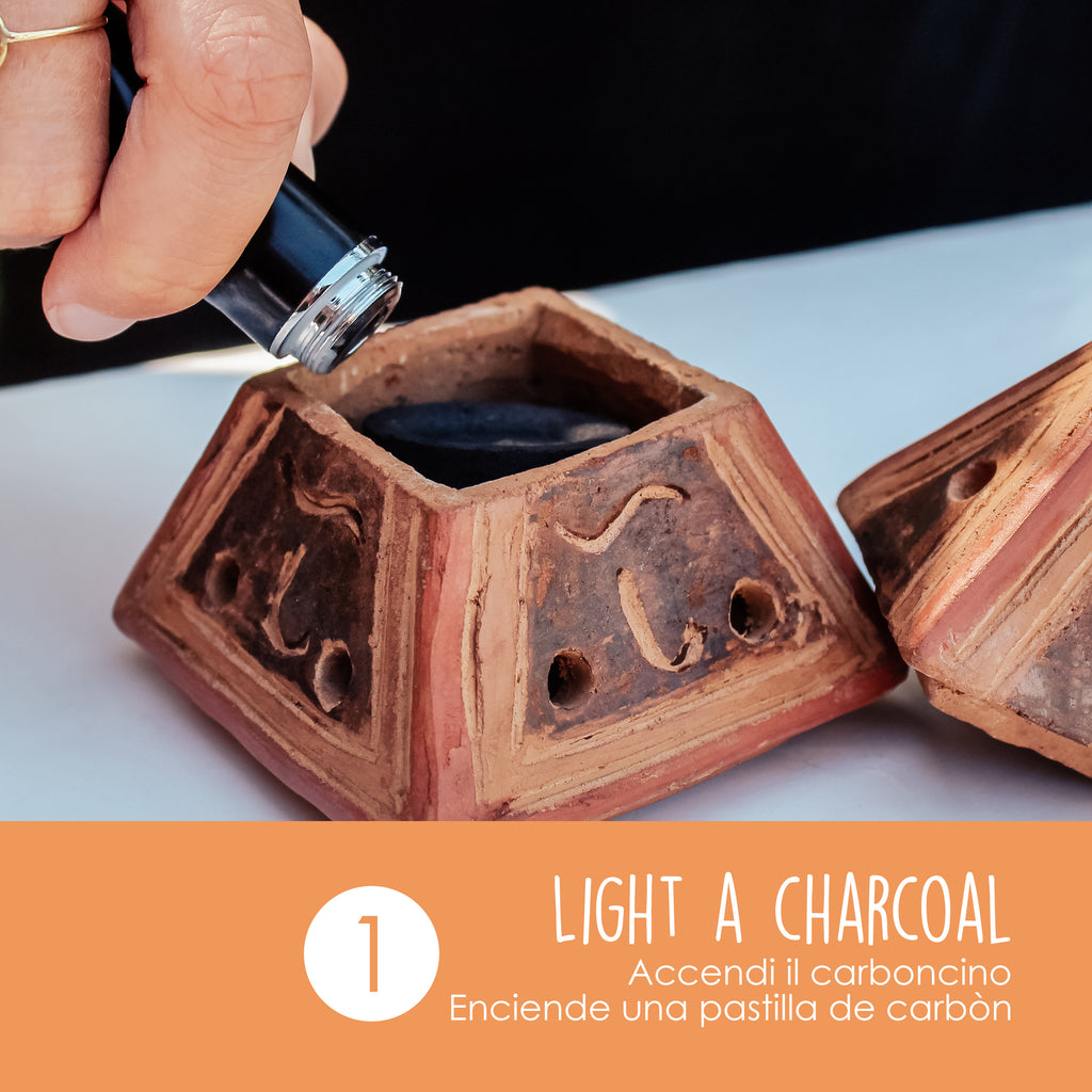 How to use them. Light a charcoal wafer, place it on the copper mesh of the brazier and then place a socket of shavings on it.
