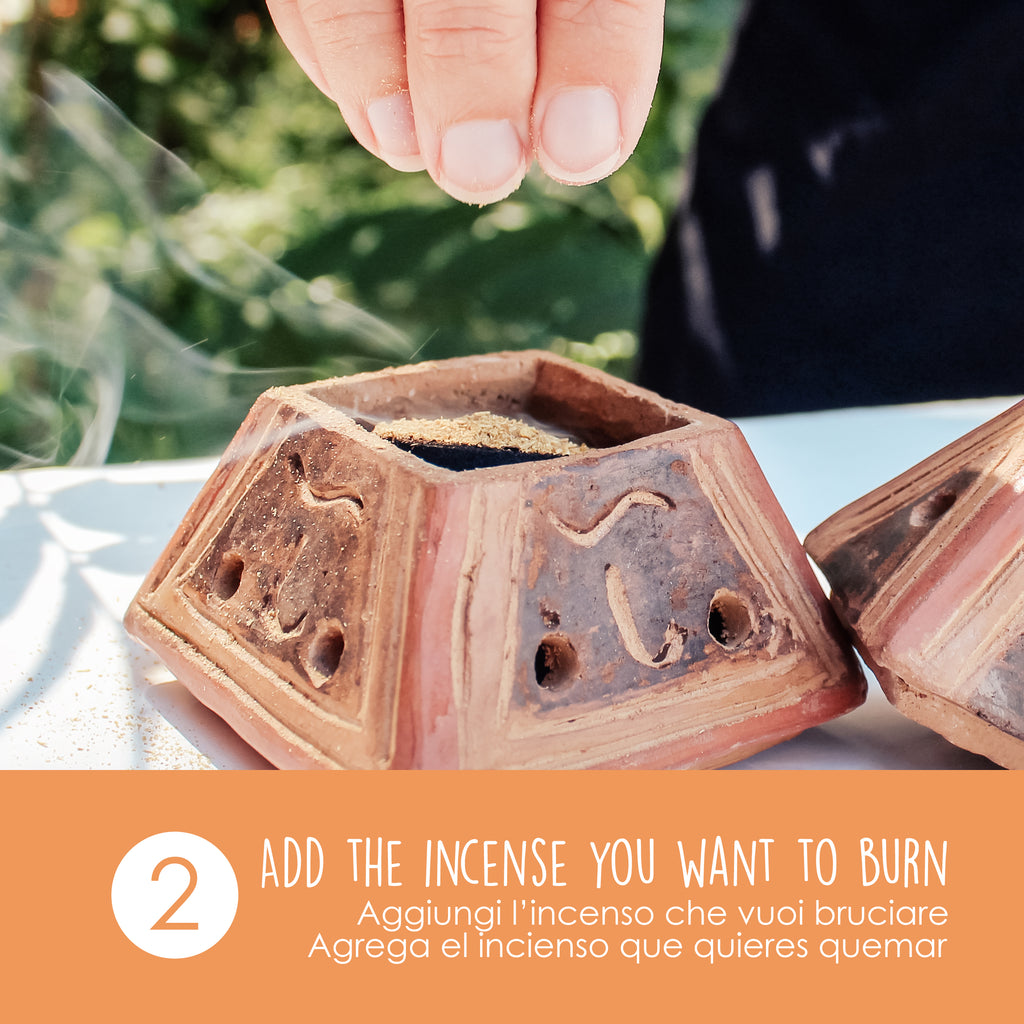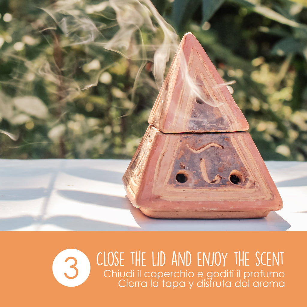 - Terracotta incense burner. Each piece is unique because it is handmade by the best South American artisans according to techniques handed down for generations. Holes at the base of the brazier and on the lid ensure intense and long-lasting fumigation.