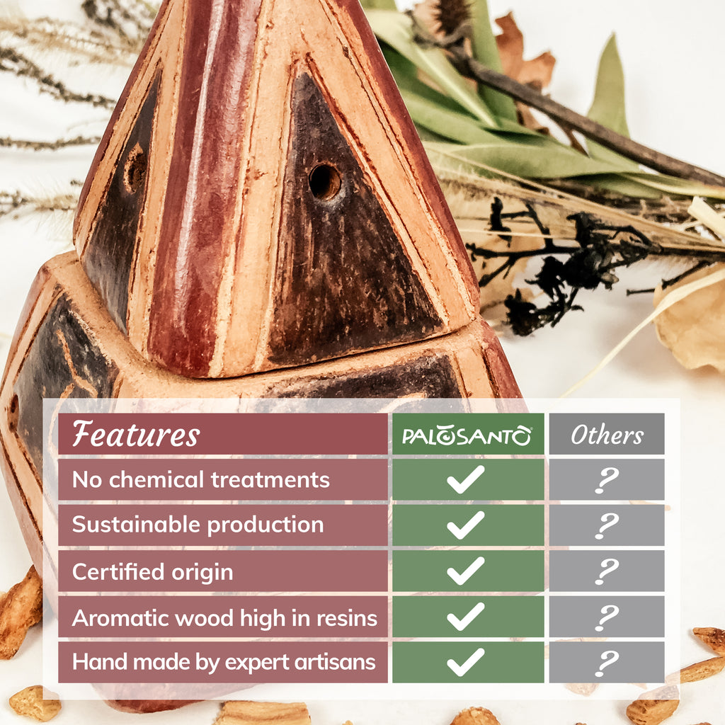 - Natural Palo Santo incense cones and powder, harvested between Ecuador and Peru. Its fresh, balsamic aroma purifies the energy of home and workplace environments. The aroma drives away stress and anxiety. It promotes inner rebalancing.