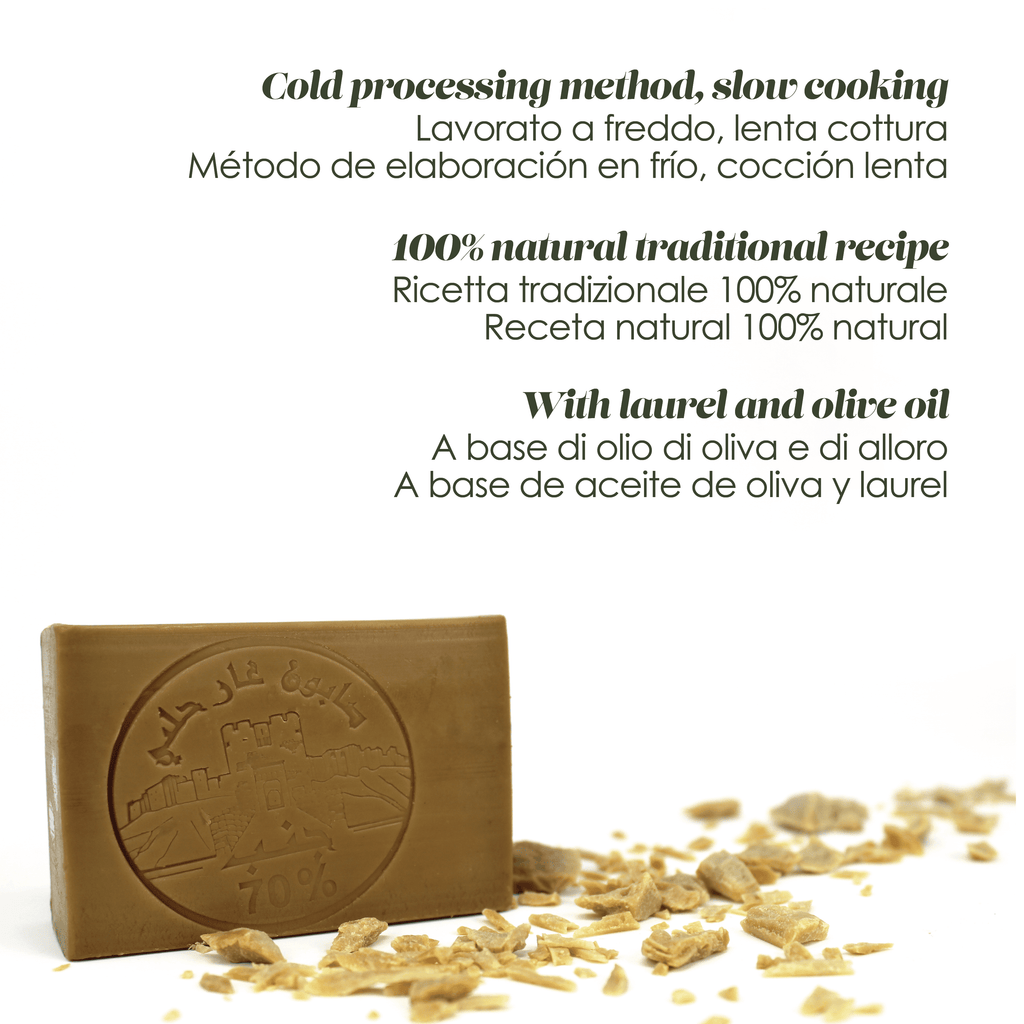 Aleppo Soap is a fine natural soap produced in Turkey using traditional Syrian craft techniques. Natural ingredients such as olive oil and laurel berry oil are used to obtain a soap with a gentle and effective cleansing action, suitable for all skin types.