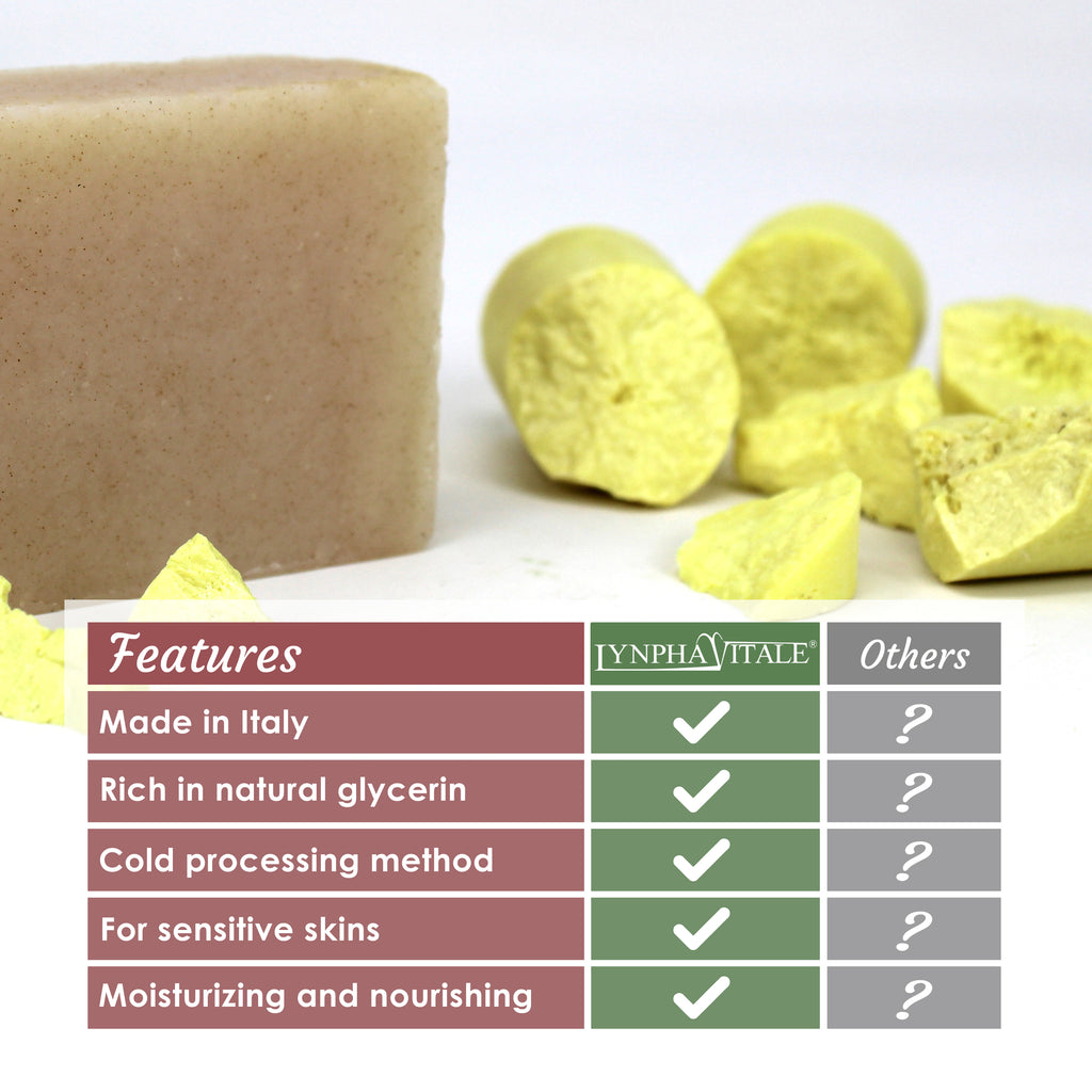 Sulfur soap is an excellent astringent, moisturizes and refreshes the skin. Sulfur has purifying and restorative properties, counteracts inflammation and soothes the epidermis.