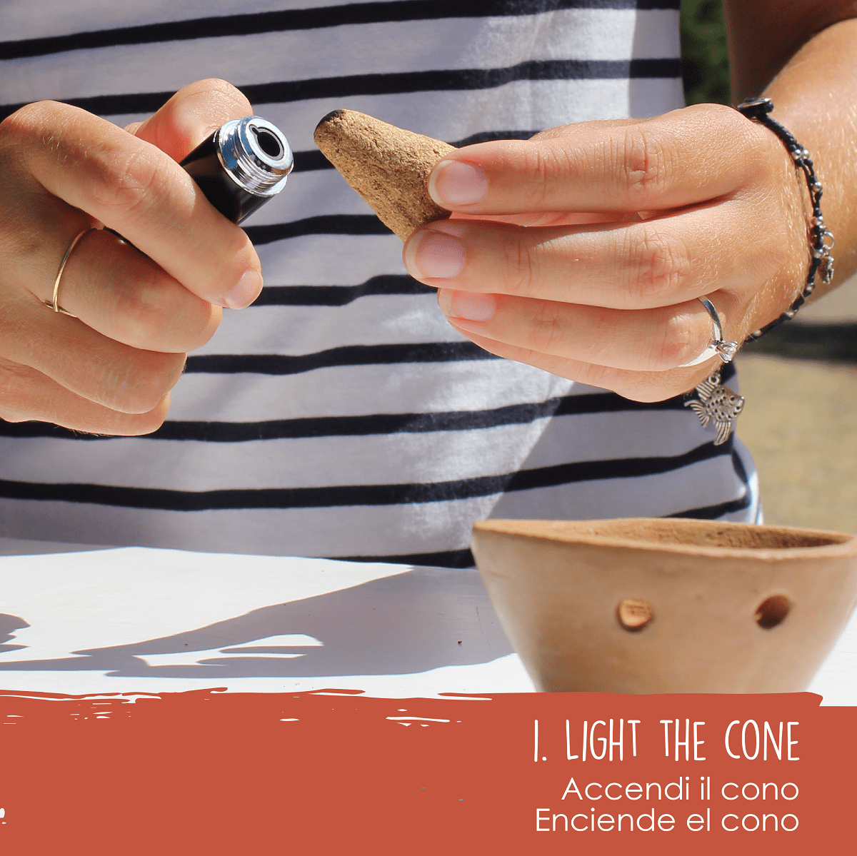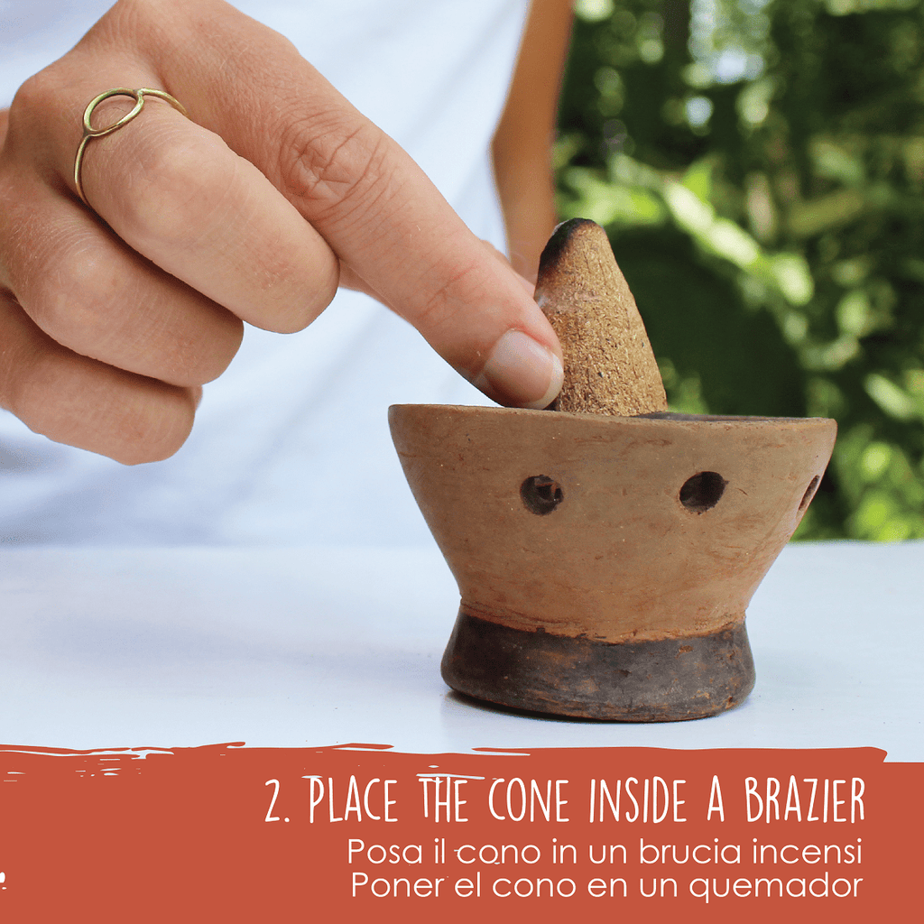1. Place the cone on the metal mesh inside the terracotta incense burner.