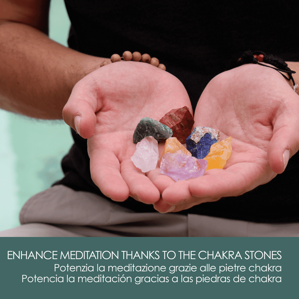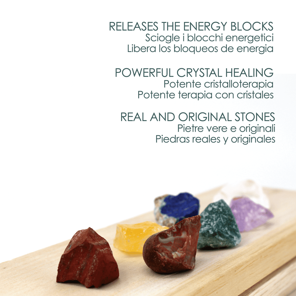 Set of 7 Chakra Stones for crystal therapy. Each stone is characterized by a different vibration and harmonizes a specific chakra distributed along the vertical axis of the body.