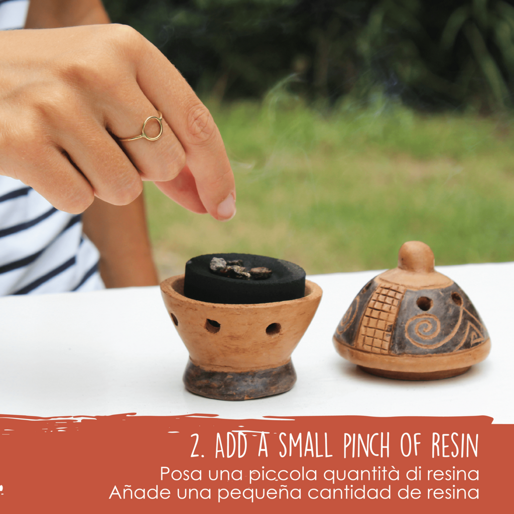 • Immediately the aroma of the resin is released. The duration of fumigation depends on the amount of resin you add to the saucer. You can also choose to mix different varieties of resin.